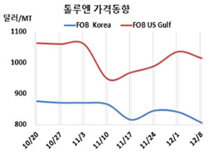 톨루엔(Toluene)은 하락했다. 톨루엔 시세는 12월8일 FOB Korea가 톤당 805달러로 35달러 하락했으나, CFR SE Asia는 900달러로 25달러 상승했다. CFR China는 805달러로 10달러, CFR India는 915달러로 40달러 떨어졌다. FOB Korea는 1월6일 770달러를 형성한 이후 꾸준히 상승하며 9월15일 1030달러까지 도달했으나 이후 하락세를 보이며 11개월 만에 800달러가 붕괴될 위기에 처해있다. 표, 그래프: <Toluene 가격동향> <화학저널 2023/12/13> |