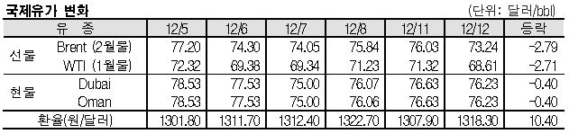 12월12일 국제유가는 미국의 금리 인하 기대가 약화되며 폭락했다. 국제유가는 미국 소비자물가지수(CPI) 발표 이후 2024년 초 미국 연방준비제도(Fed)의 금리 인하 기대가 약화되며 폭락했다. 표, 그래프: <국제유가 변화> <화학저널 2023/12/13> |