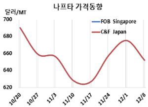나프타(Naphtha)는 폭락했다. 나프타 시세는 12월8일 C&F Japan 톤당 652달러로 23달러 폭락했다. 표, 그래프: <Naphtha 가격동향> <화학저널 2023/12/15> |