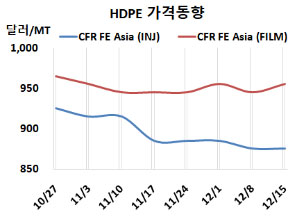 HDPE(High-Density Polyethylene)는 보합세를 형성했다. HDPE 시세는 12월13일 인젝션(Injection) 그레이드 기준 CFR FE Asia가 톤당 875달러, CFR SE Asia는 920달러로 변동이 없었다. 블로우몰딩(Blow-Molding)도 FEA가 910달러, SEA는 925달러로 보합세를 형성했다. 필름(Film)은 FEA가 955달러, SEA는 965달러로 각각 10달러 상승했고, 얀(Yarn)은 FEA가 910달러, SEA는 945달러로 변동이 없었다. CFR S Asia는 인젝션 970달러, 블로우몰딩 980달러, 필름 980달러, 얀은 970달러로 각각 5달러 올랐다. 표, 그래프: <HDPE 가격동향> <화학저널 2023/12/18> |