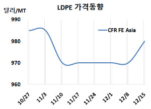 LDPE(Low-Density Polyethylene)는 상승했다. LDPE 시세는 12월13일 CFR FE Asia가 톤당 980달러, CFR SE Asia는 995달러로 각각 10달러 상승하며 6주만에 보합세를 탈출했다. CFR India도 1015달러로 10달러 올랐다. 유럽은 12월15일 FD NWE 톤당 960유로로 70유로 폭락했다. 표, 그래프: <LDPE 가격동향> <화학저널 2023/12/18> |