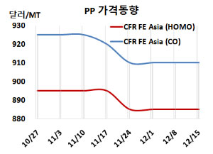 원료 프로필렌(Propylene)은 12월12일 CFR China 톤당 840달러로 10달러 하락했고, FOB Korea는 810달러로 변동이 없었다. PP(라피아: CFR FE Asia)와 프로필렌(CFR China)의 스프레드는 톤당 45달러로 10달러 늘었으나 손익분기점 150달러를 크게 밑돌아 적자가 확대되고 있는 것으로 분석된다.