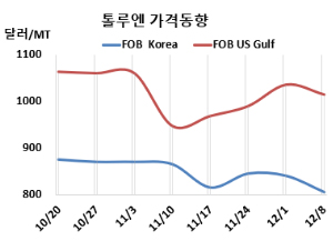 톨루엔 시세는 12월15일 FOB Korea가 톤당 825달러로 20달러 상승한 반면, CFR SE Asia는 875달러로 25달러 하락했다. CFR China는 805달러로 변동이 없었고, CFR India는 930달러로 15달러 올랐다. 표, 그래프: <Toluene 가격동향> |