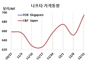 나프타(Naphtha)는 폭등했다. 나프타 시세는 12월15일 C&F Japan 톤당 695달러로 43달러 폭등했다. 표, 그래프: <Naphtha 가격동향> <화학저널 2023/12/22> |