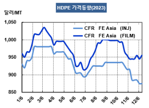 HDPE(High-Density Polyethylene)는 결국 내려갔다. HDPE 시세는 12월27일 인젝션(Injection) 그레이드 기준 CFR FE Asia가 톤당 875달러, CFR SE Asia는 920달러로 변동이 없었다. 블로우몰딩(Blow-Molding)도 FEA가 910달러, SEA는 925달러로 보합세를 형성했다. 필름(Film)은 FEA가 955달러, SEA는 965달러로 변동이 없었고, 얀(Yarn)은 FEA가 910달러, SEA는 945달러로 변동이 없었다. CFR S Asia는 인젝션 970달러, 블로우몰딩 980달러, 필름 980달러, 얀은 970달러로 보합세를 형성했다. 표, 그래프: <HDPE 가격동향> <화학저널 2024/01/02> |