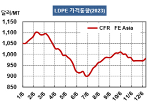 LDPE(Low-Density Polyethylene)는 1000달러 밑으로 떨어졌다. LDPE 시세는 12월27일 필름 그레이드 기준 CFR FE Asia가 톤당 980달러, CFR SE Asia는 995달러로 변동이 없었다. CFR India는 1035달러로 보합세를 형성했다. 표, 그래프: <LDPE 가격동향> <화학저널 2024/01/02> |