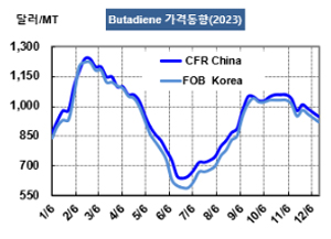 부타디엔(Butadiene)은 폭락 후 일부 회복했다. 부타디엔 시세는 12월22일 FOB Korea가 톤당 920달러, CFR SE Asia는 880달러로 변동이 없었다. CFR China는 950달러, CFR Taiwan는 960달러로 역시 보합세를 형성했다. 표, 그래프: <Butadiene 가격동향> <화학저널 2024/01/02> |