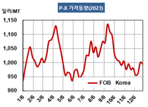 P-X(Para-Xylene)는 반짜 폭등과 폭락을 반복했다. P-X 시세는 12월29일 FOB Korea가 톤당 995달러로 5달러 하락했고, CFR SE Asia는 1025달러로 변동이 없었다. CFR Taiwan은 1020달러로 15달러 내렸다. 표, 그래프: <P-X 가격동향> <화학저널 2024/01/04> |