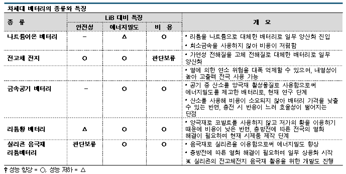 에너지밀도가 높으며 기존 흑연 음극 대신 고용량 실리콘(Silicone) 또는 리튬 금속 음극을 그대로 사용할 수 있는 점도 장점으로 파악된다.