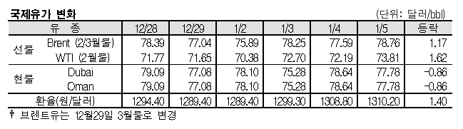 1월5일 국제유가는 중동지역의 지정학적 리스크 확대를 타고 상승했다.