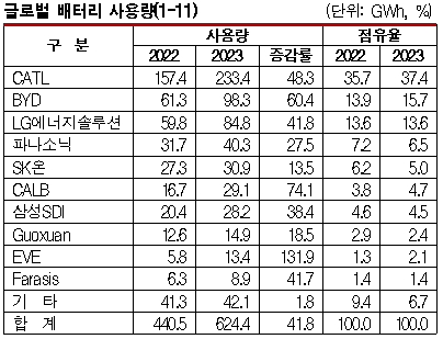 1-11월 3사 점유율 23.1% 불과 … CATL, LFP 앞세워 37.4% 달해