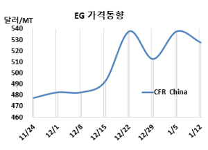 MEG 시세는 1월12일 CFR China가 톤당 528달러, CFR SE Asia는 533달러로 각각 10달러 하락했다. 표, 그래프: <EG 가격동향> |