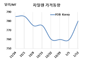 용제(Solvent) 그레이드 M-X 시세는 1월12일 FOB Korea가 톤당 780달러, CFR SE Asia는 840달러로 20달러 상승했다. CFR China는 840달러로 20달러, CFR India는 865달러로 25달러 올랐다. 표, 그래프: <Xylene 가격동향> |