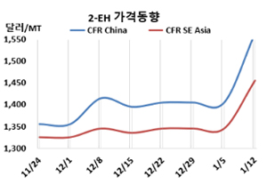 옥소알코올(Oxo-Alcohol)은 폭등했다. 2-EH(Ethylhexanol) 시세는 1월12일 CFR China가 톤당 1565달러로 160달러, CFR SE Asia는 1455달러로 110달러 폭등했다. 표, 그래프: <2-EH 가격동향> <화학저널 2024/01/19> |