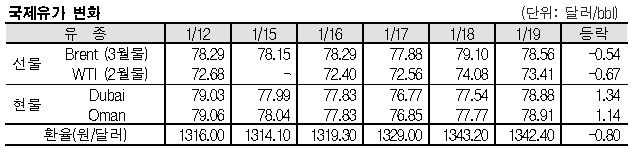 1월19일 국제유가는 중국의 수요 둔화 우려로 하락했다. 국제유가는 중국의 원유 수요 둔화가 확대되며 하락했다. 표, 그래프: <국제유가 변화> <화학저널 2024/01/22> |