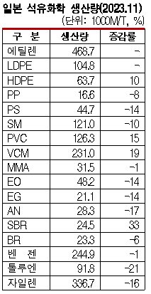 일본이 에틸렌(Ethylene) 가동률을 끌어올리고 있다. 표, 그래프: <일본의 스팀크래커 가동률 변화>, <일본 석유화학 생산량(2023.11)> <화학저널 2024/01/22> |