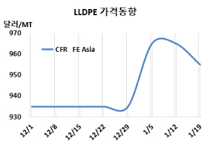 LLDPE(Linear Low-Density Polyethylene)는 하락했다. LLDPE 시세는 1월17일 CFR FE Asia가 톤당 955달러로 10달러 하락했고, CFR SE Asia는 985달러로 변동이 없었다. CFR S Asia도 965달러로 보합세를 형성했다. 유럽은 1월19일 FD NWE 톤당 1080유로로 80유로 폭등했다. 표, 그래프: <LLDPE 가격동향> <화학저널 2024/01/22> |