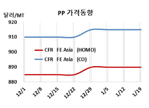 아시아 PP 시세는 1월17일 CFR FE Asia 기준 라피아(Raffia) 및 인젝션(Injection) 그레이드가 톤당 890달러, IPP Film 및 BOPP는 900달러, 블록 코폴리머(Block Copolymer)도 915달러로 변동이 없었다. CFR SE Asia는 라피아 및 인젝션 955달러, IPP Film 및 BOPP 965달러, 블록 코폴리머 988달러로 각각 20달러 상승했다. CFR S Asia도 라피아·인젝션 1010달러, BOPP 및 IPP Film 1030달러, 블록 코폴리머 1045달러로 각각 20달러 상승했다. 유럽은 1월19일 라피아가 FD NWE 톤당 1070유로, 블록 코폴리머는 1130유로로 각각 45유로 상승했다.