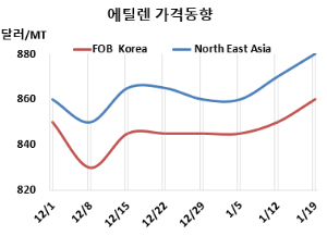 에틸렌 시세는 1월19일 CFR NE Asia가 톤당 880달러로 10달러, CFR SE Asia는 890달러로 20달러 상승했다. FOB Korea는 860달러로 10달러 올랐다.