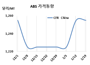 ABS(Acrylonitrile Butadiene Styrene)는 유럽만 폭등했다. ABS 시세는 1월17일 CFR China가 톤당 1255달러, CFR SE Asia는 1275달러로 변동이 없었다. CFR S Asia도 1305달러로 보합세를 형성했다. 반면, 유럽 시장은 1월19일 FD NWE 톤당 1750유로로 200유로 대폭등했다. 표, 그래프: <ABS 가격동향> <화학저널 2024/01/24> |