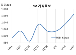 SM(Styrene Monomer)은 상승했다. SM 시세는 1월19일 FOB Korea가 톤당 1065달러로 30달러, CFR SE Asia는 1105달러로 40달러 상승했다. CFR China는 1075달러로 30달러, CFR India는 1125달러로 20달러 올랐다. 표, 그래프: <SM 가격동향> <화학저널 2024/01/24> |