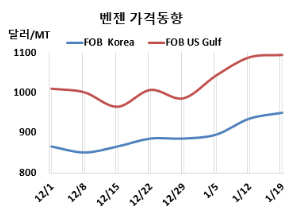 벤젠 시세는 1월19일 FOB Korea가 톤당 950달러로 15달러, CFR SE Asia는 925달러로 5달러, CFR India는 950달러로 5달러 상승했다. CFR China는 965달러로 5달러, CFR Taiwan은 975달러로 10달러 올랐다. 표, 그래프: <Benzene 가격동향> <화학저널 2024/01/24> |