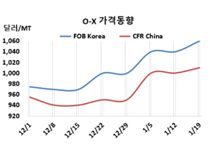 O-X(Ortho-Xylene)는 상승했다. O-X 시세는 1월19일 FOB Korea가 톤당 1060달러로 20달러, CFR SE Asia는 1020달러로 10달러 상승했다. CFR China도 1010달러로 10달러 올랐다. 표, 그래프: <O-X 가격동향> <화학저널 2024/01/25> |