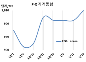 P-X(Para-Xylene)는 상승했다. P-X 시세는 1월19일 FOB Korea가 톤당 1010달러, CFR SE Asia는 1030달러로 각각 15달러 상승했다. CFR Taiwan는 1035달러로 10달러 올랐다. 표, 그래프: <P-X 가격동향> <화학저널 2024/01/25> |