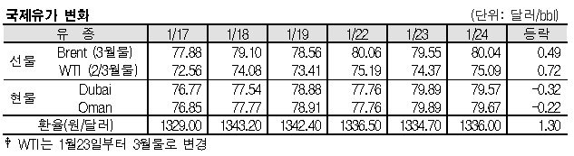 표, 그래프: <국제유가 변화> <화학저널 2024/01/25> |