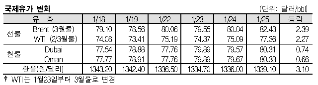 한국석유공사에 따르면, 런던원유거래소(ICE)의 브렌트유(Brent) 선물유가는 배럴당 82.43달러로 전일대비 2.39달러 급등했고, 뉴욕상업거래소(NYMEX)의 WTI(서부텍사스 경질유)는 77.36달러로 2.27달러 올랐다.