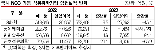 국내 NCC(Naphtha Cracking Center) 산업 침체가 심각한 것으로 파악된다. 표, 그래프: <국내 NCC 가동 석유화학기업 영업실적 변화> <화학저널 2024/01/26> |