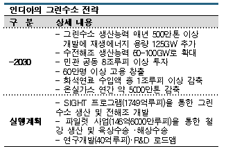 국가 그린수소 전략에서는 2030년까지 △매년 500만톤 이상의 그린수소 생산능력 개발, 재생에너지 용량 125GW 추가 △전해조 생산능력 60-100GW로 확대 △민관 공동으로 8조루피 이상 투자 △60만명 이상의 고용 창출 △화석연료 수입액을 총 1조루피 이상 감축 △온실가스 연간 약 5000만톤 감축 등을 추진할 계획이다.