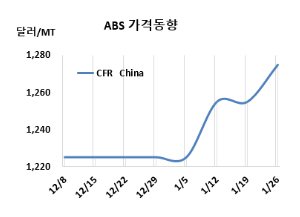 ABS(Acrylonitrile Butadiene Styrene)는 상승했다. ABS 시세는 1월24일 CFR China가 톤당 1275달러, CFR SE Asia는 1295달러로 각각 20달러 상승했다. CFR S Asia도 1315달러로 10달러 올랐다. 반면, 유럽 시장은 1월26일 FD NWE 톤당 1750유로로 변동없이 지난주 폭등세로부터 벗어났다. 표, 그래프: <ABS 가격동향> <화학저널 2024/01/31> |