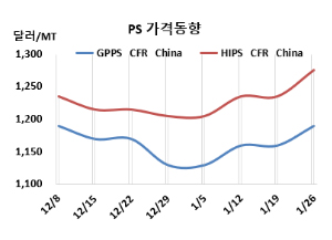GPPS(General Purpose PS) 시세는 1월24일 CFR China가 1190달러로 30달러, CFR SE Asia는 1215달러로 20달러 상승했다. CFR India는 1255달러로 50달러 급등했다.