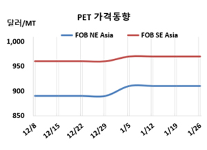 PET(Polyethylene Terephthalate)는 인디아만 하락했다. 병(Bottle) 그레이드 PET 시세는 1월24일 FOB NE Asia가 910달러, FOB SE Asia는 970달러로 변동이 없었다. CFR S Asia는 955달러로 20달러 하락했다. 유럽은 1월26일 FD NWE 톤당 1150유로로 40유로 상승했다. 표, 그래프: <PET 가격동향> <화학저널 2024/02/02> |