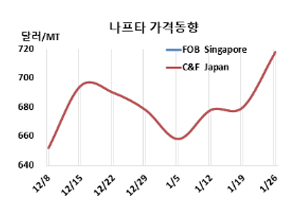 나프타(Naphtha)는 폭등했다. 나프타 시세는 1월26일 C&F Japan 톤당 718달러로 38달러 폭등했다. 표, 그래프: <Naphtha 가격동향> <화학저널 2024/02/02> |