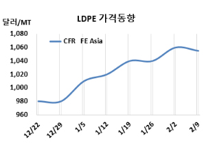 LDPE(Low-Density Polyethylene)는 등락이 엇갈렸다. LDPE 시세는 2월7일 CFR FE Asia가 톤당 1055달러로 5달러 하락했지만, CFR SE Asia는 1095달러로 10달러 상승했다. CFR India는 1155달러로 변동이 없었다. 유럽은 2월9일 FD NWE 톤당 1220유로로 30유로 올랐다. 표, 그래프: <LDPE 가격동향> <화학저널 2024/02/13> |
