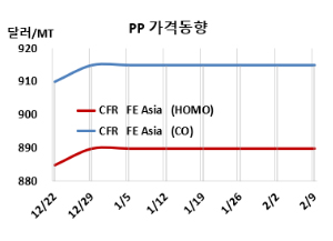 PP(Polypropylene)는 인디아만 하락했다. 아시아 PP 시세는 2월7일 CFR FE Asia 기준 라피아(Raffia) 및 인젝션(Injection) 그레이드가 톤당 890달러, IPP Film 및 BOPP는 900달러, 블록 코폴리머(Block Copolymer)도 915달러로 변동이 없었다. CFR SE Asia도 라피아 및 인젝션 965달러, IPP Film 및 BOPP 975달러, 블록 코폴리머 998달러로 보합세를 형성했다. CFR S Asia는 라피아·인젝션 1020달러로 20달러, BOPP 및 IPP Film 1035달러, 블록 코폴리머 1050달러로 각각 20달러 하락했다. 반면, 유럽은 2월9일 라피아가 FD NWE 톤당 1200유로, 블록 코폴리머는 1270유로로 각각 40유로 상승했다. 표, 그래프: <PP 가격동향> <화학저널 2024/02/13> |