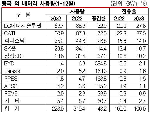 2022년까지 중국 배터리 생산기업들이 내수시장에 집중해 LG에너지솔루션이 글로벌 1위 지위를 굳힐 수 있었으나 2023년에는 중국 CATL의 배터리 사용량이 87.80GWh로 72.5% 증가하고 점유율은 27.5%로 4.7%포인트 상승하며 LG에너지솔루션과의 격차가 0.3%포인트까지 좁혀져 조만간 역전당할 것으로 예상된다.