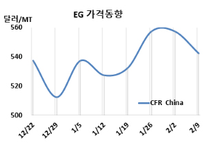 MEG(Monoethylene Glycol)는 하락했다. MEG 시세는 2월9일 CFR China가 톤당 543달러로 15달러, CFR SE Asia는 553달러로 10달러 하락했다. 표, 그래프: <EG 가격동향> <화학저널 2024/02/15> |