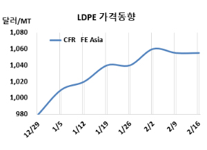 LDPE 시세는 2월14일 CFR FE Asia가 톤당 1055달러, CFR SE Asia는 1095달러로 변동이 없었다. CFR India는 1155달러로 보합세를 형성했다. 유럽은 2월16일 FD NWE 톤당 1260유로로 40유로 상승했다.