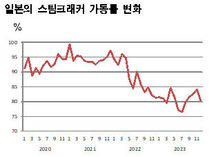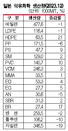 석유화학산업은 2023년 최악의 침체를 겪은 것으로 나타났다. 표, 그래프: <일본의 스팀크래커 가동률 변화>, <일본 석유화학 생산량(2023.12)> <화학저널 2024/02/19> |