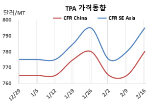 PTA 시세는 2월16일 CFR China가 톤당 780달러, CFR SE Asia는 795달러로 각각 15달러 상승했다. CFR India도 840달러로 15달러 올랐다. 표, 그래프: <TPA 가격동향> |