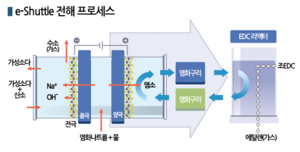 반면, e-Shuttle 공법은 음극의 가성소다는 기존과 동일하게 얻을 수 있고 양극의 염소는 용액 형태의 1가 구리(CuCl)와 반응시켜 염화구리로 만들고 구리를 촉매로 염소를 에틸렌에 부가해 EDC를 생성하는 방식이다.