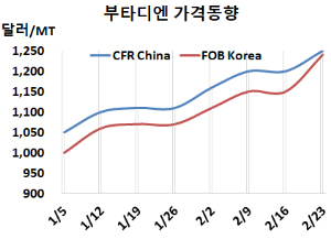 부타디엔(Butadiene)은 폭등했다. 부타디엔 시세는 2월16일 FOB Korea가 톤당 1240달러로 90달러, CFR SE Asia는 1200달러로 70달러 폭등했다. 중화권도 CFR China은 1250달러로 50달러 상승했고, CFR Taiwan도 1280달러로 80달러 치솟았다. 표, 그래프: <Butadiene 가격동향> <화학저널 2024/02/27> |