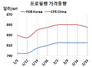 프로필렌(Propylene)은 하락했다. 프로필렌 시세는 2월23일 FOB Korea가 톤당 815달러로 변동이 없었으나, CFR SE Asia는 860달러로 15달러 떨어지며 하락세를 이어갔다. 중화권은 CFR China가 845달러, CFR Taiwan은 855달러로 각각 5달러 하락했다. 표, 그래프: <Propylene 가격동향> <화학저널 2024/02/27> |