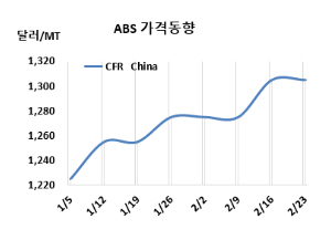 ABS(Acrylonitrile Butadiene Styrene)는 변동이 없었다. ABS 시세는 2월21일 CFR China가 톤당 1305달러, CFR SE Asia는 1315달러로 변동이 없었다. CFR S Asia도 1325달러로 보합세를 형성했다. 유럽 시장도 2월23일 FD NWE 톤당 1850유로로 변동이 없었다. 표, 그래프: <ABS 가격동향> <화학저널 2024/02/28> |