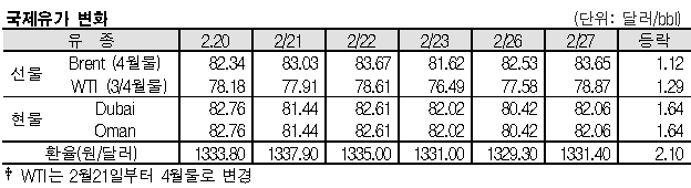 한국석유공사에 따르면, 런던원유거래소(ICE)의 브렌트유(Brent) 선물유가는 배럴당 83.65달러로 전일대비 1.12달러 상승했으며, 뉴욕상업거래소(NYMEX)의 WTI(서부텍사스 경질유) 역시 1.29달러 올라 78.87달러로 거래를 마감했다.
