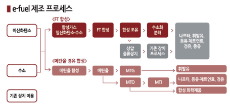 e-fuel은 메탄올(Methanol) 경유 프로세스의 조기 상용화가 기대되고 있다. 표, 그래프: <e-fuel 제조 프로세스> <화학저널 2024년 03월 04일> |