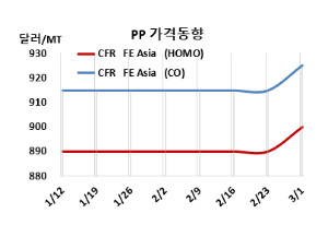 3월 중국에 공급하는 PP 호모(Homo) 그레이드에 대해 사우디가 CFR 880달러, 아시안 기업이 CFR 910-920달러를 제시했다. 동남아에는 중국이 CFR 970달러를, 한국이 CFR 1000달러를, 아시안 기업이 CFR 980-1000달러를 요구했다.